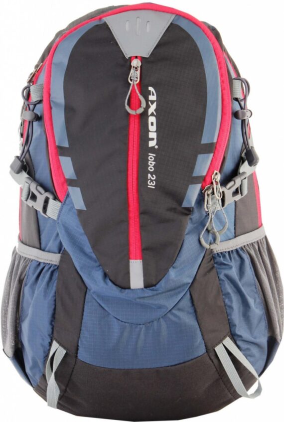 Sportovní batoh Axon Lobo je vyrobený z nylonu Ripstop 320D v černé barvě. Batoh jednu velkou a dvě menší kapsy na zip. Na bocích batohu jsou síťované kapsy na pití. Batoh má odvětrávaná záda pomocí síťované konstrukce VCS, nastavitelný prsní a bederní popruh, kompresní popruhy, úchyty na hole, reflexní prvky, píšťalku a je uzpůsobený pro vak na vodu.
